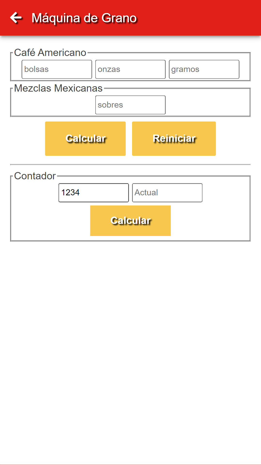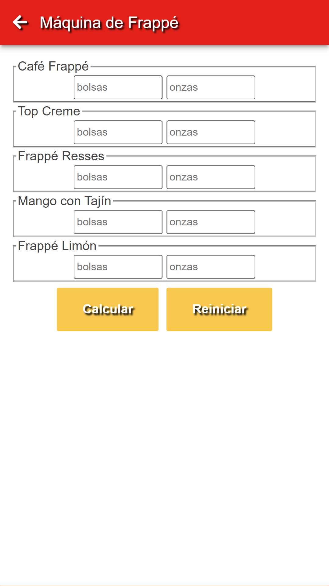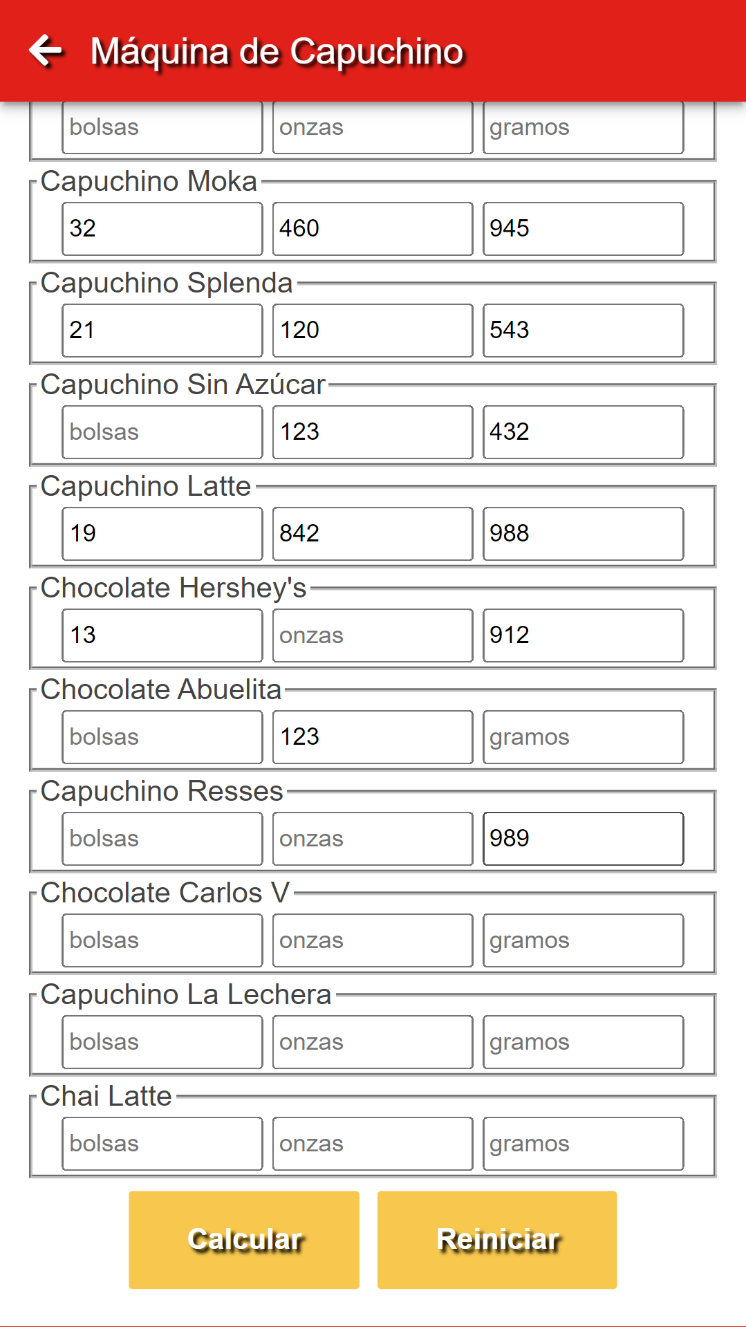 Es una sencilla aplicación PWA para calcular el total de onzas que se pueden preparar sumando la cantidad de polvo representada en la maquina de capuchino, bolsas cerradas y el peso de las bolsas abiertas. Pensada para lideres de tienda de OXXO.